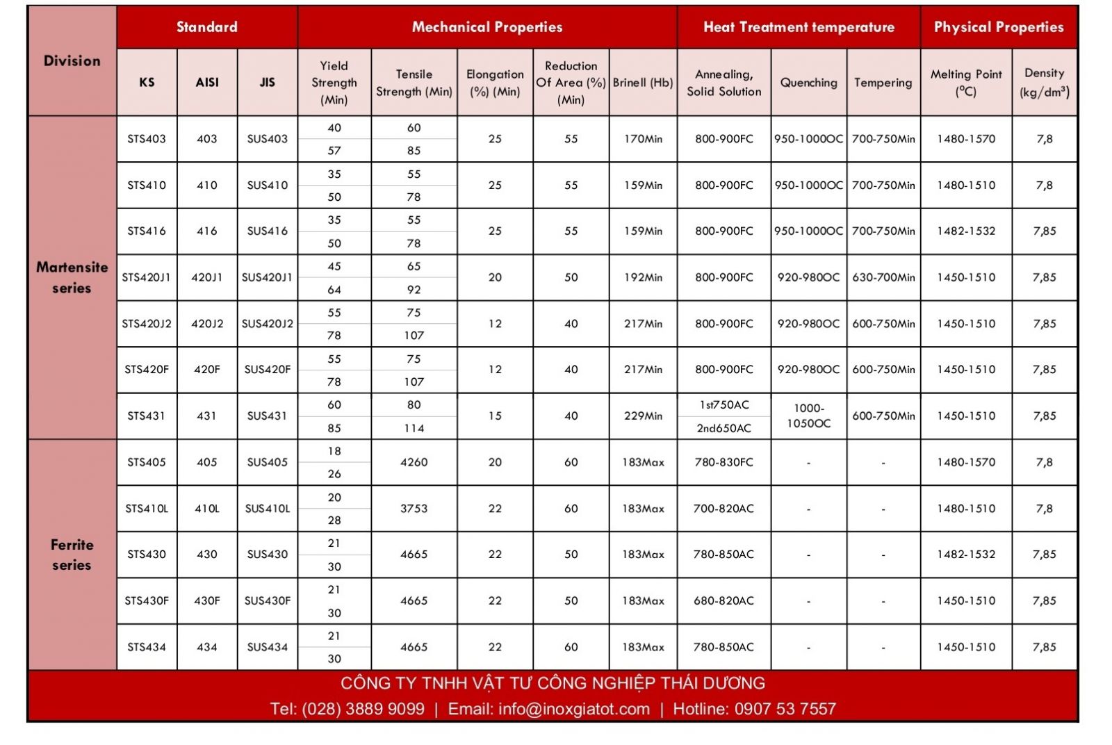 BẢNG CƠ LÝ TÍNH INOX 430